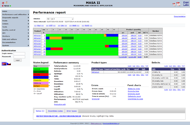 Example of graphical preview of „Lis 3“ machine usage during 8 hour shift. Moreover, you can see a basic performance characteristic of the machine and its operators