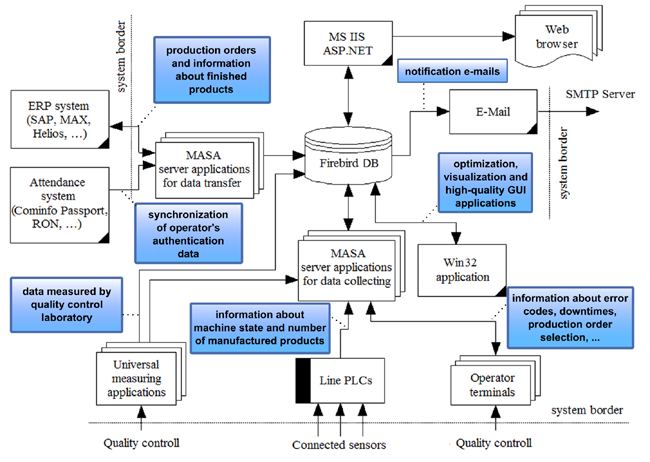 We have developed a set of applications providing connection with technological units (DataCross, …) and diagnostic and maintenance tools (backup monitor, E-mail agent, database monitor, ...). For data presentation, we have chosen a web application technology, which is a visible part of the system. Special customer requirements are programmed as stand-alone modules.